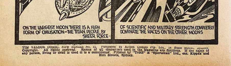 TIM VALOUR COMIC NEW SERIES No. 11. Published by Action Comics Pty. Ltd., 14 Bond Street, Sydney. Copyright. All rights reserved. Names of all characters used in the Magazine are fictitious. If the name of any person living or dead is used it is a conincidence. Printed by "Truth" and "Sportsman" Ltd., cnr. Kippax and Holt Streets, Sydney.