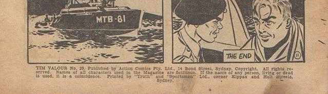Tim Valour No. 29. Published by Action Comics Pty. Ltd., 14 Bond Street, Sydney. Copyright. All rights reserved. Names of all characters used in the Magazine are fictitious. If the name of any person, living or dead is used, it is a coincidence. Printed by "Truth" and "Sportsman" Ltd., corner Kippax and Holt streets, Sydney.