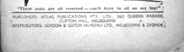 Publishers: Atlas Publications Pty. Ltd., 262 Queens Parade, Clifton Hill, Melbourne, Distributors: Gordon & Gotch (A/asia) Ltd., Melbourne & Sydney. Printed for the publishers, Atlas Publications Pty. Ltd., 262 Queens Parade, Clifton Hill, Vic., by Rotary Colorprint Co. Pty. Ltd., 15 Hamilton St., Sydney.