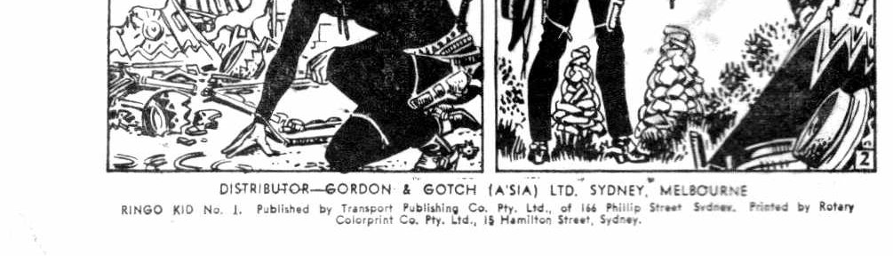 Distributor--Gordon & Gotch (A'sia) Ltd. Sydney, Melbourne. Ringo Kid No. 1. Published by Transport Publishing Co. Pty. Ltd., of 166 Phillip Street, Sydney. Printed by Rotary Colorprint Co. Pty. Ltd., 18 Hamilton Street, Sydney.