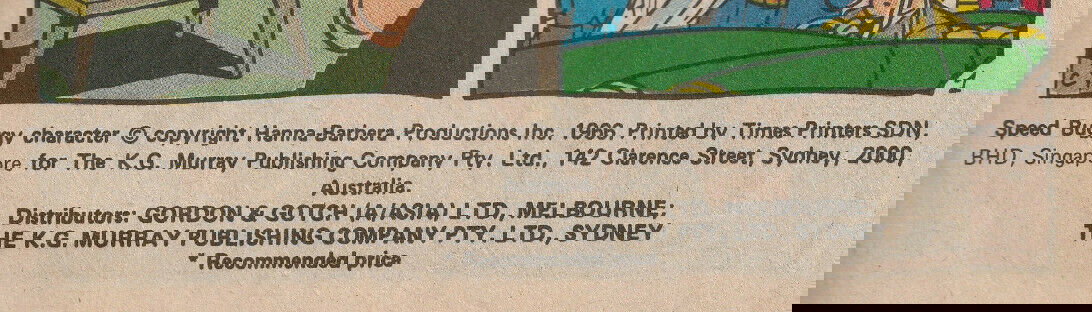 Speed Buggy character © copyright Hanna-Barbera Productions Inc. 1966. Printed by Times Printers SDN, BHD, Singapore for The K.G. Murray Publishing Company Pry. Ltd., 142 Clarence Street, Sydney, 2000, Australia. Distributors: Gordon & Gotch (A/asia) Ltd., Melbourne; The K.G. Murray Publishing Company Pty. Ltd., Sydney.