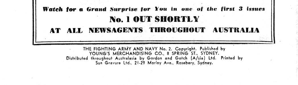 The Fighting Army and Navy No. 2. Copyright. Published by Young's Merchandising Co., 8 Spring St., Sydney. Distributed throughout Australasia by Gordon and Gotch (A/sia) Ltd. Printed by Sun Gravure Ltd., 21-29 Morley Ave., Rosebery, Sydney.