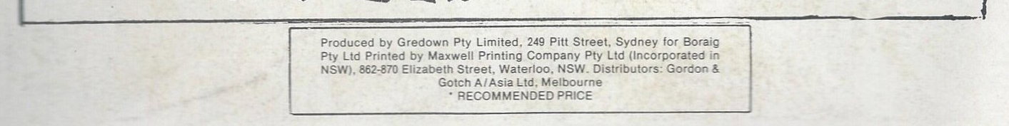 Produced by Grodown Pty Limited, 249 Pitt Street, Sydney for Boraig Pty Ltd. Printed by Maxwell Printing Company Pty Ltd (Incorporated in NSW), 862-870 Elizabeth Street, Waterloo, NSW. Distributors: Gordon & Gotch A/Asia Ltd, Melbourne.