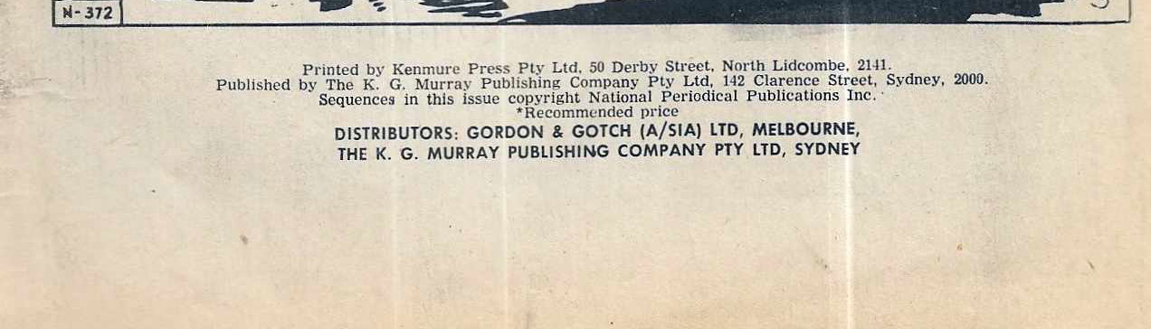 Printed by Kenmure Press Pty Ltd, 50 Derby Street, North Lidcombe, 2141. Published by The K. G. Murray Publishing Company Pty Ltd, 142 Clarence Street, Sydney, 2000. Sequences in this issue copyright National Periodical Publications Inc. Distributors: Gordon & Gotch (A/sia) Ltd, Melbourne, The K. G. Murray Publishing Company Pty Ltd, Sydney.