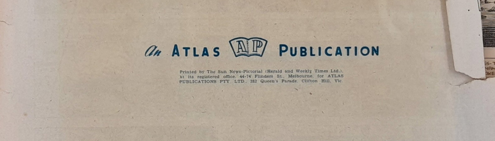 Printed by The Sun News-Pictorial (Herald and Weekly Times Ltd.). at its registered office, 44-74 Flinders St., Melbourne, for Atlas Publications Pty. Ltd.. 282 Queen's Parade, Clifton Hill, Vic.