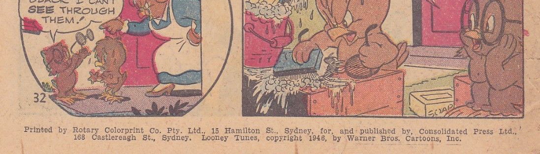 Printed by Rotary Colorprint Co. Pty. Ltd., 15 Hamilton St., Sydney, for, and published by, Consolidated Press Ltd., 168 Castlereagh St., Sydney. Looney Tunes, copyright 1948, by Warner Bros. Cartoons, Inc.