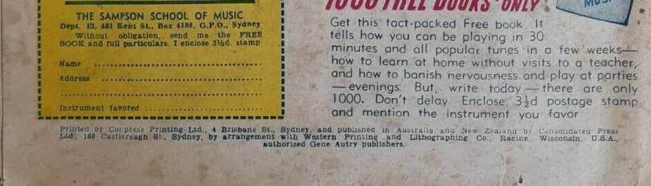 Printed by Conpress Printing Ltd., 4 Brisbane St., Sydney, and published in Australia and New Zealand by Consolidated Press Ltd., 168 Castlereagh St., Sydney, by arrangement with Western Printing and Lithographing Co., Racine, Wisconsin, U.S.A., authorised Gene Autry publishers.
