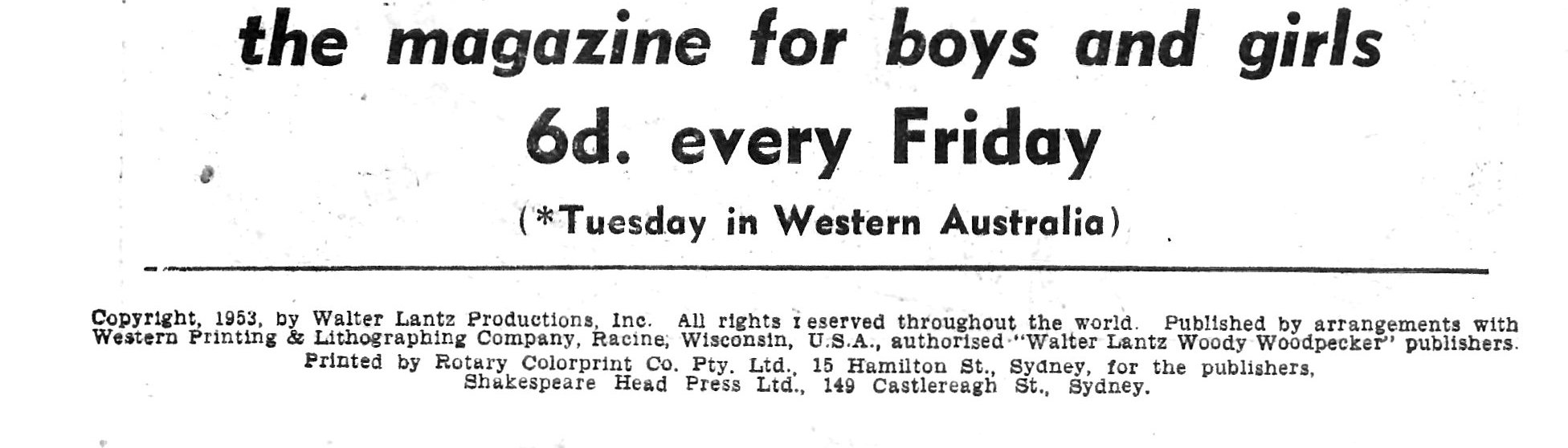 Copyright, 1953, by Walter Lantz Productions Inc. All rights reserved throughtout the world. Published by arrangement with Western Printing & Lithographing Company, Racine, Wisconsin, U.S.A., authorised "Walter Lantz Woody Woodpecker" publishers. Printed by Rotary Colorprint Co. Pty. Ltd., 15 Hamilton St., Sydney, for the publishers, Shakespeare Head Press Ltd., 149 Castlereagh St., Sydney.