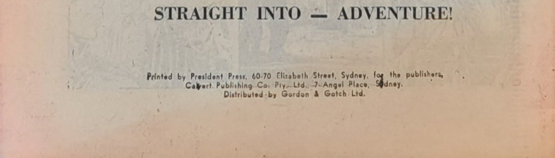 Printed by President Press, 60-70 Elizabeth Street, Sydney, for the publishers, Calvert Publishing Co. Pty. Ltd., 7 Angel Place, Sydney. Distributed by Gordon & Gotch Ltd.