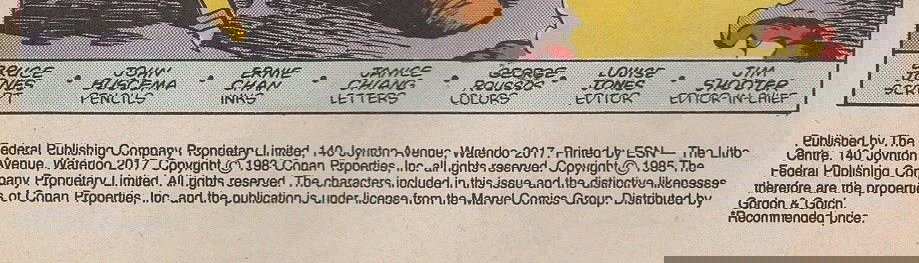 Published the The Federal Publishing Company Proprietary Limited, 140 Joynton Avenue, waterloo 2017. Printed by ESN--The Litho Centre, 140 Joynton Avenue, Waterloo 2017. Copyright © 1983 Conan Properties, Inc. all rights reserved. Copyright © 1985 The Federal Publishing Company Proprietary Limited. All rights reserved. The characters included in this issue and the distinctive likenesses therefore are the properties of Conan Properties, Inc. and the publication is under licence from the Marvel Comics Group. Distributed by Gordon & Gotch.