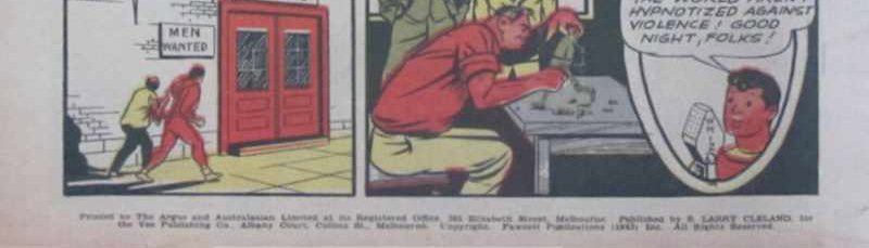 Printed by The Argus and Australasian Limited at its Registered Office, 365 Elizabeth Street, Melbourne. Publihsed by S. Larry Cleland, for the Vee Publishing Co., Albany Court, Collins St., Melbourne. Copyright. Fawcett Publications (1943) Inc. All rights reserved.