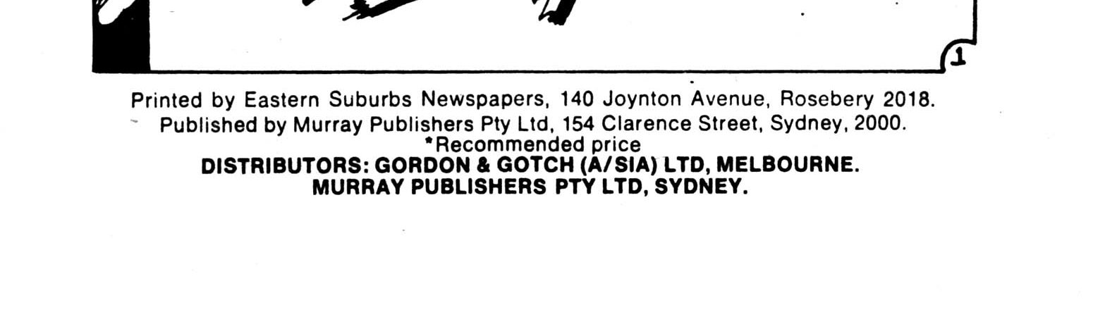 Printed by Eastern Suburbs Newspapers, 140 Joynton Avenue, Rosebery 2018. Published by Murray Publishers Pty Ltd, 154 Clarence Street, Sydney, 2000. Distributors: Gordon & Gotch (A.sia) Ltd, Melbourne. Murray Publishers Pty Ltd, Sydney.