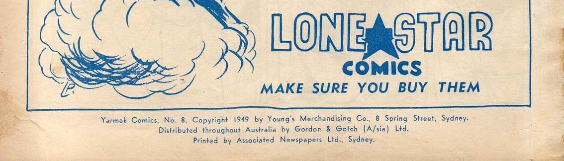 Yarmak Comics, No. 8, copyright 1949 by Young's Merchandising Co., 8 Spring Street, Sydney. Distributed throughout Australia by Gordon & Gotch (A/sia), Ltd. Printed by Associated Newspapers Ltd., Sydney.