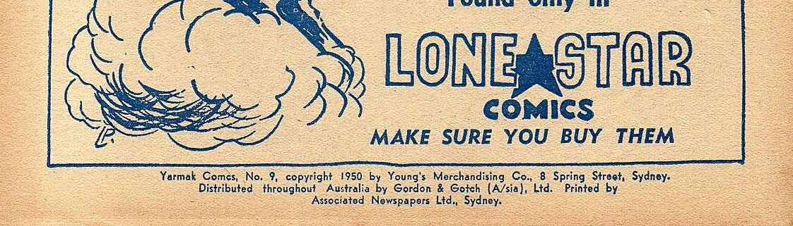 Yarmak Comics, No. 9, copyright 1950 by Young's Merchandising Co., 8 Spring Street, Sydney. Distributed throughtou Australia by Gordon & Gotch (A/sia), Ltd. Printed by Associated Newspapers Ltd., Sydney.