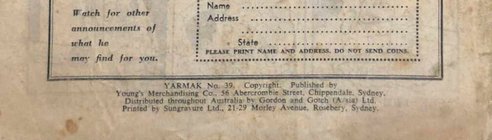 Yarmak No. 39, Copyright. Published by Young's Merchandising Co., 56 Abercrombie Street, Chippendale, Sydney. Distributed throughout Australia by Gordon and Gotch (A/sia) Ltd. Printed by Sungravure Ltd., 21-29 Morley Avenue, Rosebery, Sydney.