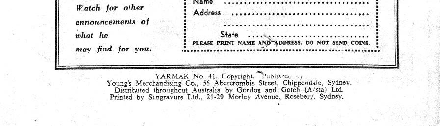 Yarmak No. 41. Copyright. Published by Young's Merchandising Co., 56 Abercrombie Street, Chippendale, Sydney. Distributed throughout Australia by Gordon and Gotch (a/sia) Ltd. Printed by Sungravure Ltd., 21-29 Moreley Avenue, Rosebery, Sydney.