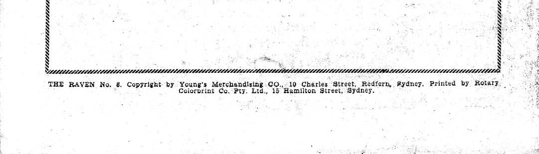 The Raven No. 8 Copyright by Youngs Merchandising Co., 10 Charles Street, Redfern, Sydney. Printed by Rotary Colorprint Co. Pty. Ltd., 15 Hamilton Street, Sydney.