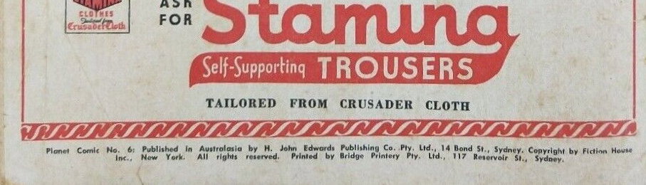 Planet Comic No. 6: Published in Australasia by H. John Edwards Publishing Co. Pty. Ltd., 14 Bond St., Sydney. Copyright by Fiction House Inc., New York. All rights reserved. Printed by Bridge Printery Pty. Ltd., 117 Reservoir St., Sydney.