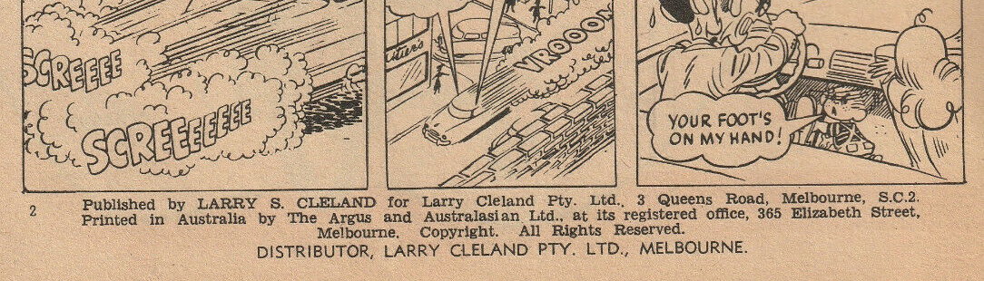Published by Larry S. Cleland for Larry Cleland Pty. Ltd., at its registered office, 365 Elizabeth Street, Melbourne. Copyright. All rights reserved. Distributor, Lary Cleland Pty. Ltd., Melbourne. Read the adventures of Dennis the Menace daily in "The Argus" in Victoria and Tasmania; in the "Telegraph" in Queensland' in "The Advertiser" in South Australia (and in color in "The Sunday Advertiser"); and in Western Australia every Sunday in the "Sunday Times." Watch for Dennis the Menace comic book, 9d, all newsagents every month, all states and New Zealand.