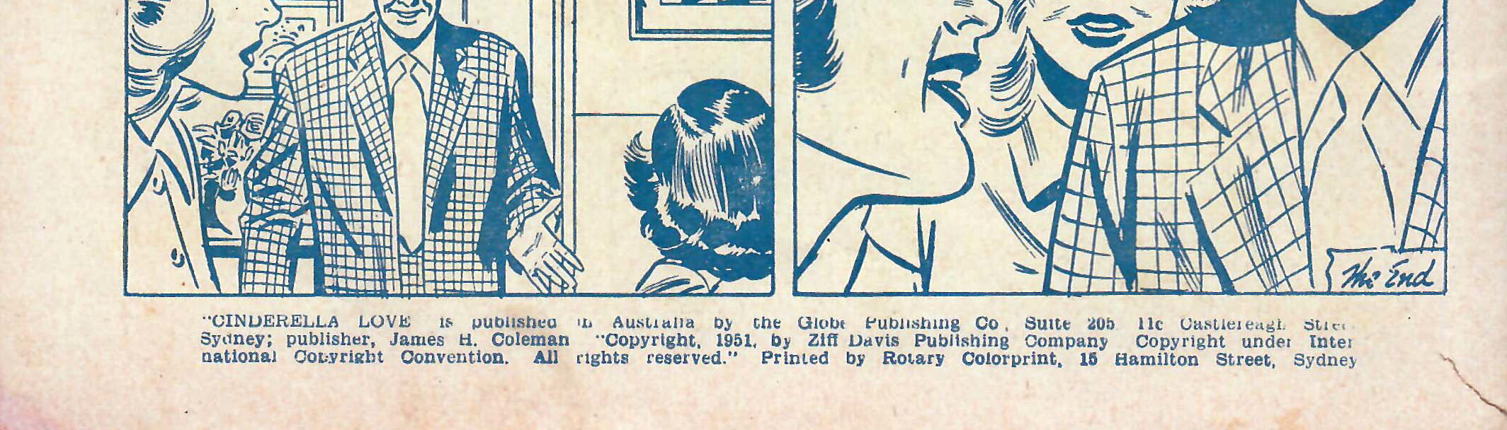 "Cinderella Love" is published in Australia by the Globe Publishing Co., Suite 209, 11c Castlereagh Street, Sydney; publisher, James H. Coleman. "Copyright, 1951, by Ziff Davis Publishing Company. Copyright under international copyright convention. All rights reserved." Printed by Rotary Colorprint, 15 Hamilton Street, Sydney.