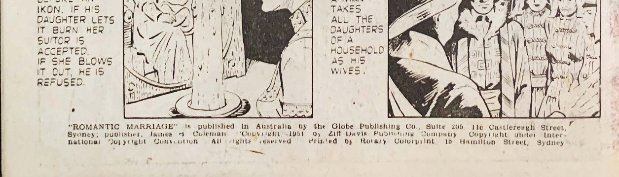 "Romantic Marriage" is published in Australia by Globe Publishing Co., Suite 205 11c Castlereagh Street, Sydney; publisher James H Coleman. Copyright 1951 by Ziff Davis Publishing Company. Copyright under international Copyright Convention. All rights reserved. Printed by Rotary Colorprint, 15 Hamilton Street, Sydney.