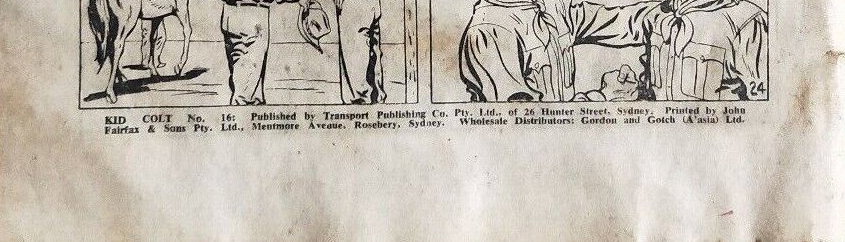 Kid Colt No. 16. Published by Transport Publishing Co. Pty. Ltd., of 26 Hunter Street, Sydney. Printed by John Fairfax & Sons Pty. Ltd., Mentmore Avenue, Roseberry, Sydney. Wholesale Distributors; Gordon and Gotch (A'asia) Ltd.