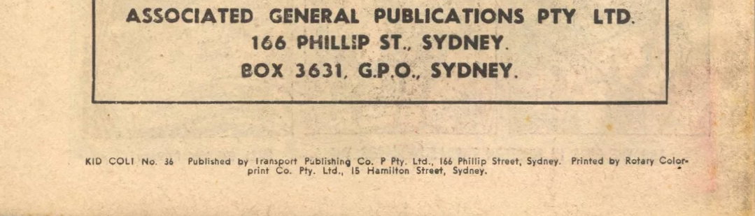 Kid Colt No. 36. Published by Transport Publishing Co. Pty. Ltd., of 166 Phillip Street, Sydney, Printed by Rotary Colorprint Co. Pty. Ltd., 15 Hamilton Street, Sydney.