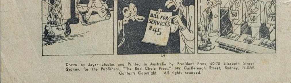 Drawn by Jayar Studios and printed in Australia by President Press, 60-70 Elizabeth Street, Sdyney, for the publiishers, "The Red Circle Press," 149 Castlereagh Street, Sydney, N.S.W. Contents copyright. All rights reserved.