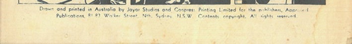 Drawn and printed in Australia by Jayar Studios and Conpress Printing Limited for the publishers, Approved Publications, 81-83 Walker Street, Nth Sydney, N.S.w. Contents copyright. All righs reserved. Distributed throughout Australia by Gordon & Gotch (A/sia) Ltd.