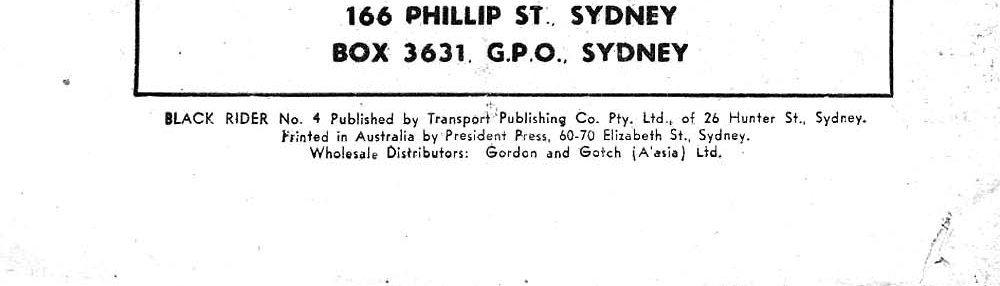 Black Rider No. 4. Published by Transport Publishing Co. Pty. Ltd., of 26 Hunter St., Sydney. Printed in Australia by President Press, 60-70 Elizabety St., Sydney. Wholesale Distributors: Gordon and Gotch (A'sia) Ltd.