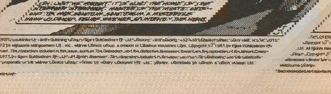 The Defenders is published by Yaffa Publishing Group (Page Publications Pty. Ltd. Division), Yaffa Building, 432-436 Elizabeth Street, Surry Hills, N.S.W. 2010. Copyright © 1972 by Magazine Managmeent Co., Inc., Marvel Comics Group, a division of Cadence Industries Corp. Copyright © 1981 by Page Publications Pty. Ltd…