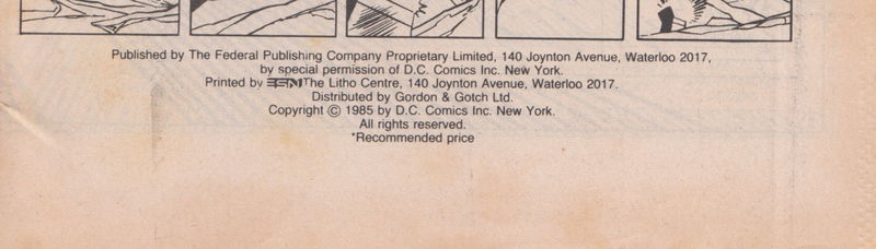 Published by The Federal Publishing Company Proprietary Limited, 140 Joynton Avenue, Waterloo 2017, by special permission of D.C. Comics Inc. New York. Printed by ESN The Litho Centre, 140 Joynton Avenue, Waterloo 2017. Distributed by Gordon & Gotch Ltd. Copyright © 1985 by D.C. Comics Inc. New York. All rights reserved.