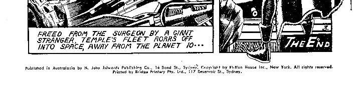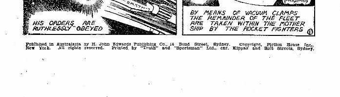 [Interior] Published in Australasia by H. John Edwards Publishing Co., 14 Bond Street, Sydney. Copyright Fiction House inc., New York. All rights reserved. Printed by "Truth" and "Sportsman" Ltd., cnr. Kippax and Holt Streets, Sydney. [Cover] Published in Australasia by H. John Edwards Publishing Co., 14 Bond St., Sydney. Copyright by Fiction House Inc., New York. All rights reserved. Printed by Bridge Printery Pty. Ltd., 117 Reservoir St., Sydney.