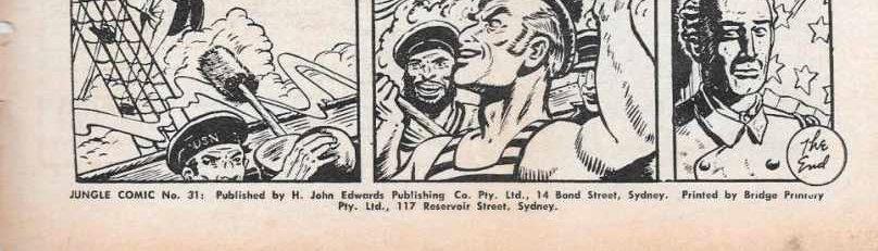 [Page 3 of David Farragut story] Jungle No. 31. Published by H. John Edwards Publishing Co, Pty. Ltd., 14 Bond Street, Sydney. Copyright. All rights reserved by Fiction House Inc., 130 West 42nd Street, New York, 18, U.S.A. Names of all characters used in the Magazine are fictitious. If the name of any person living or dead is used, it is a coincidence. Printed by "Truth" and "Sportsman" Ltd., corner of Kippax and Holt Streets, Sydney." [Page 4] Jungle Comic No. 31: Published by H. John Edwards Publishing Co. Pty. Ltd., 14 Bond Street, Sydney. Printed by Bridge Printery Pty. Ltd., 117 Reservoir Street, Sydney.