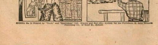 [Interior] Sheena No. 3: Printed by 'Truth' and 'Sportsman' Ltd., Kippax and Holt Sts., Sydney, for the publishers, H. John Edwards Publishing Co., 14 Bond St., Sydney. [Cover] Sheena No. 3. Published in Australasia by H. John Edwards Publishing Co. Pty. Ltd., Sydney. Copyright by Fiction House Inc., New York. All rights reserved. Printed by Bridge Printery Pty. Ltd., 117 Reservoir St., Sydney.