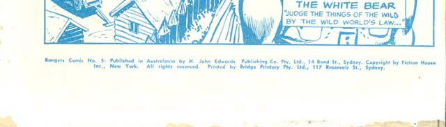 Rangers Comic No. 5. Publishe in Australasia by H. John Edwards Publishing Co. Pty. Ltd., 14 Bond St., Sydney. Copyright by Fiction House Inc., New York. All rights reserved. Printed by Bridge Printery Pty. Ltd., 117 Reservoir St., Sydney.