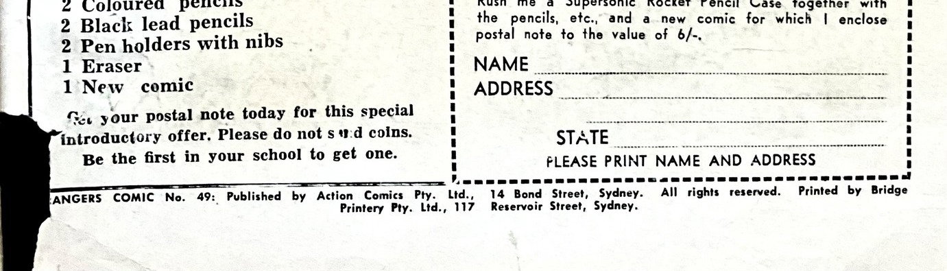 Rangers Comic No. 49: Published by Action Comics Pty. Ltd., 14 Bond Street, Sydney. All rights reserved. Printed by Bridge Printery Pty. Ltd., 117 Reservoir Street, Sydney.