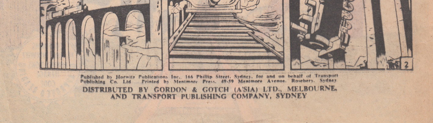 Published by Horwitz Publications Inc., 166 Phillip Street, Sydney, for and on behalf of Transport Publishing Co. Ltd. Printed by Mentmore Press, 49-59 Mentmore Avenue, Rosebery, Sydney. Distributed by Gordon & Gotch (A'sia) Ltd., Melbourne, and Transport Publishing Company, Sydney.