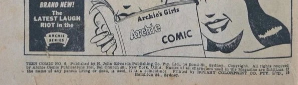 Teen Comic No. 6. Published by H. John Edwards Publishing Co. Pty. Ltd., 14 Bond St., Sydney. Copyright. All rights reserved by Archie Comic Publications Inc., 241 Church St., New York, U.S.A. Names of all characters used in the magazine are fictitious. If the name of any person, living or dead, is used, it is a coincidence. Printed by Rotary Colorprint Co. Pty. Ltd., 15 Hamilton St., Sydney.