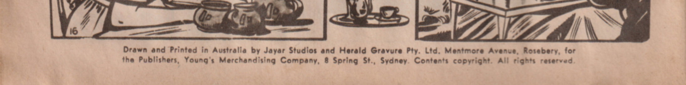 Drawn and printed in Australia by Jayar Studios and Herald Gravure Pty. Ltd. Mentmore Avenue, Rosebery, for the publishers, Young's Merchandising Company, 8 Spring St., Sydney. Contents copyright. All rights reserved. Distributed throughout Australia by Gordon & Gotch (A/sia) Ltd. All names used throughout are fictitious and do not refer to any living person.