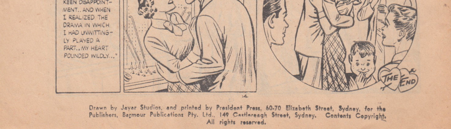 Drawn by Jayar Studios, and printed by President Press, 60-70 Elizabety Street, Sydney, for the Publishers, Barmour Publicatios Pty. Ltd., 149 Castlereagh Street, Sydney. Contents Copyright. All rights reserved. Distributed throughout Australia by Gordon & Gotch (A/sia) Ltd. All names used throughout are fictitious and do not refer to any living person.