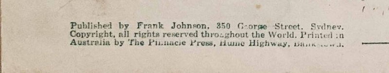 Published by Frank Johnson, 350 George Street, Sydney. Copyright, all rights reserved throughout the world. Printed in Australia by The Pinnacle Press, Hume Highway, Bankstown.