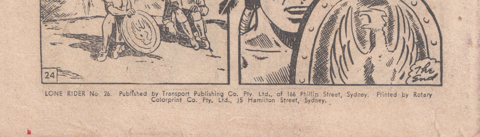 Lone Rider No. 26. Published by Transport Publishing Co. Pty. Ltd., of 66 Phillip Street, Sydney. Printed by Rotary Colorprint Co. Pty. Ltd., 15 Hamilton Street, Sydney.