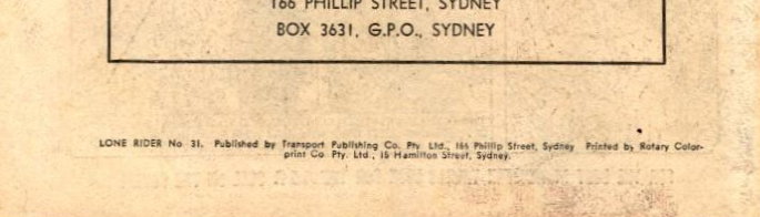 Lone Rider No 31. Published by Transport Publishing Co. Pty. Ltd., 166 Phillip Street, Sydney. Printed by Rotary Colorprint Co. Pty. Ltd., 15 Hamilton Street, Sydney.