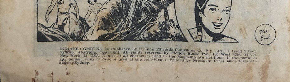 Indians Comic No. 26. Published by H. John Edwards Publishing Co. Pty. Ltd., 14 Bond Street, Sydney, Australia. Copyright. All rights reserved by Fiction House Inc., 130 West 42nd Street, New York, 18, USA. Names of all characters used in the Magazine are fictitious. If the name of any person living or dead is used, it is a coincidence. Printed by President Press, 60-70 Elizabeth Street, Sydney.