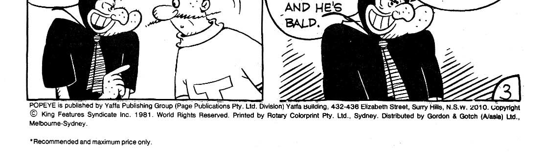 Popeye is published by Yaffa Publishing Group (Page Publications Pty. Ltd. Division) Yaffa Building, 432-436 Elizabeth Street, Surry Hills, N.S.W. 2010. Copyright © King Features Syndicate Inc. 1981. World rights reserved. Printed by Rotary Colorprint Pty. Ltd., Sydney. Distributed by Gordon & Gotch (A/asia) Ltd., Melbourne-Sydney.