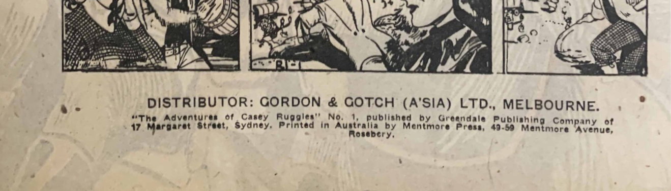 Distributor: Gordon & Gotch (A'sia) Ltd., Melbourne. "The Adventures of Casey Ruggles" No. 1, published by Greendale Publishing Company of 17 Margaret Street, Sydney. Printed by Mentmore Press, 49-59 Mentmore Avenue, Rosebery.