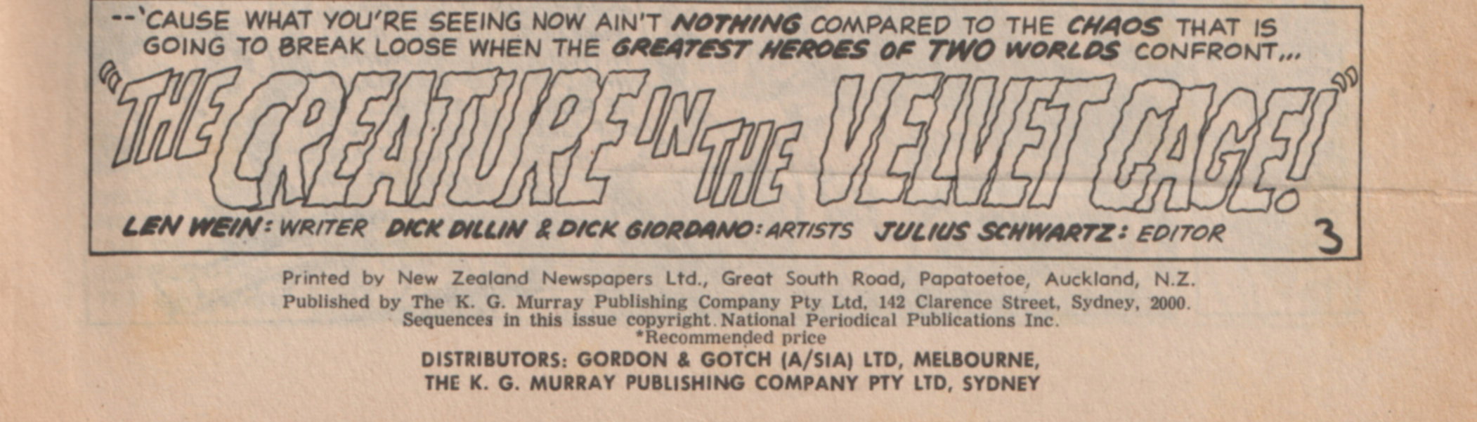 Printed by New Zealand Newspapers Ltd., Great South Road, Papatoetoe, Auckland, N.Z. Published by The K. G. Murray Publishing Company Pty Ltd, 142 Clarence Street, Sydney, 2000. Sequences in this issue copyright National Periodical Publications Inc. Distributors: Gordon & Gotch (A/sia) Ltd, Melboune, The K. G. Murray Publishing Company Pty Ltd, Sydney.