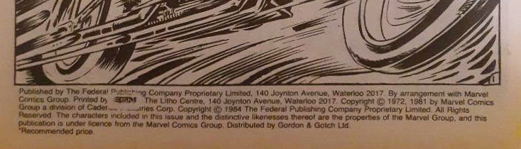 Published by The Federal Publishing Company Proprietary Limited, 140 Joynton Avenue, Waterloo 2017. By arrangement with Marvel Comics Group. Printed by ESN The Litho Centre, 140 Joynton Avenue, Waterloo 2017. Copyright © 1972, 1981 by Marvel Comics Group a division of Cadence Industries Corp. Copyright © 1984 The Federal Publishing Company Proprietary Limited. All Rights Reserved. The characters included in this issue and the distinctive likenesses thereof are the properties of the Marvel Group, and this publication is under licence from the Marvel Comics Group. Distributed by Gordon & Gotch Ltd.