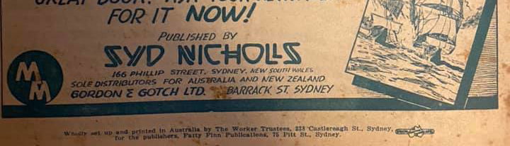 John Ryan's 'Panel by Panel' reports this first issue as November 1945. Also includes art by Bartlett Adamson. An advertisement for Middy Malone on the back cover states "Published by Syd Nicholls, 166 Phillip Street, Sydney, New South Wales".